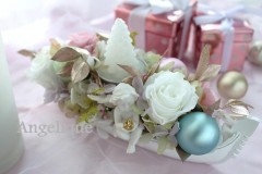 ゴンドラにキラキラのクリスマスツリー型のキャンドルとオーナメント(カラフルな玉)にお花のアレンジを乗せています。