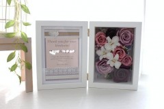 お名前入り感謝状の入ったフォトフレームアレンジ。