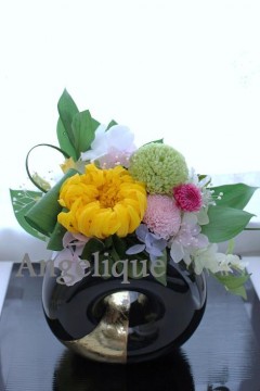 大きなイエローの輪菊を使用してオシャレにアレンジしました。