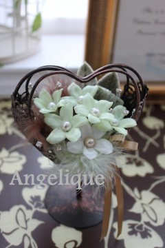 バレンタインを意識したブロンズのハートスタンドを使ってキラキラふわふわなアレンジを作っていただきます。