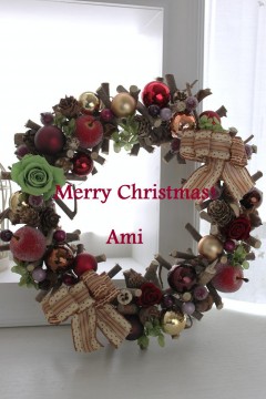 今月のアレンジは小枝でできたリースを使ったクリスマスリースです。