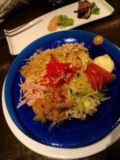 おすすめメニューの中に ラーメンサラダ(冷やし中華)を始めました。器にグリーンサラダをひいて その上に冷やし中華をのせました。