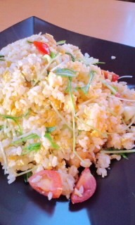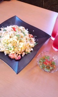 『チキンのオイスターソース唐揚げと水菜、ミニトマト、青野菜の タイチャーハン ナンプラーソース添え』でした。