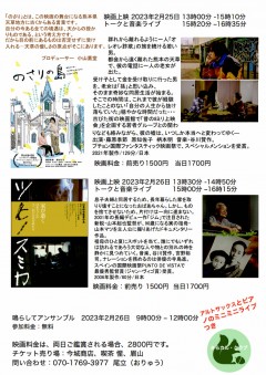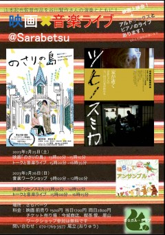 「映画×音楽ライブ@Sarabetsu」●映画「のさりの島」●音楽ワークショップ「鳴らしてアンサンブル」●映画「ツヒノスミカ」