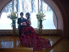 カラードレスは深いワインピンクとベルベットのリボンのデザインが